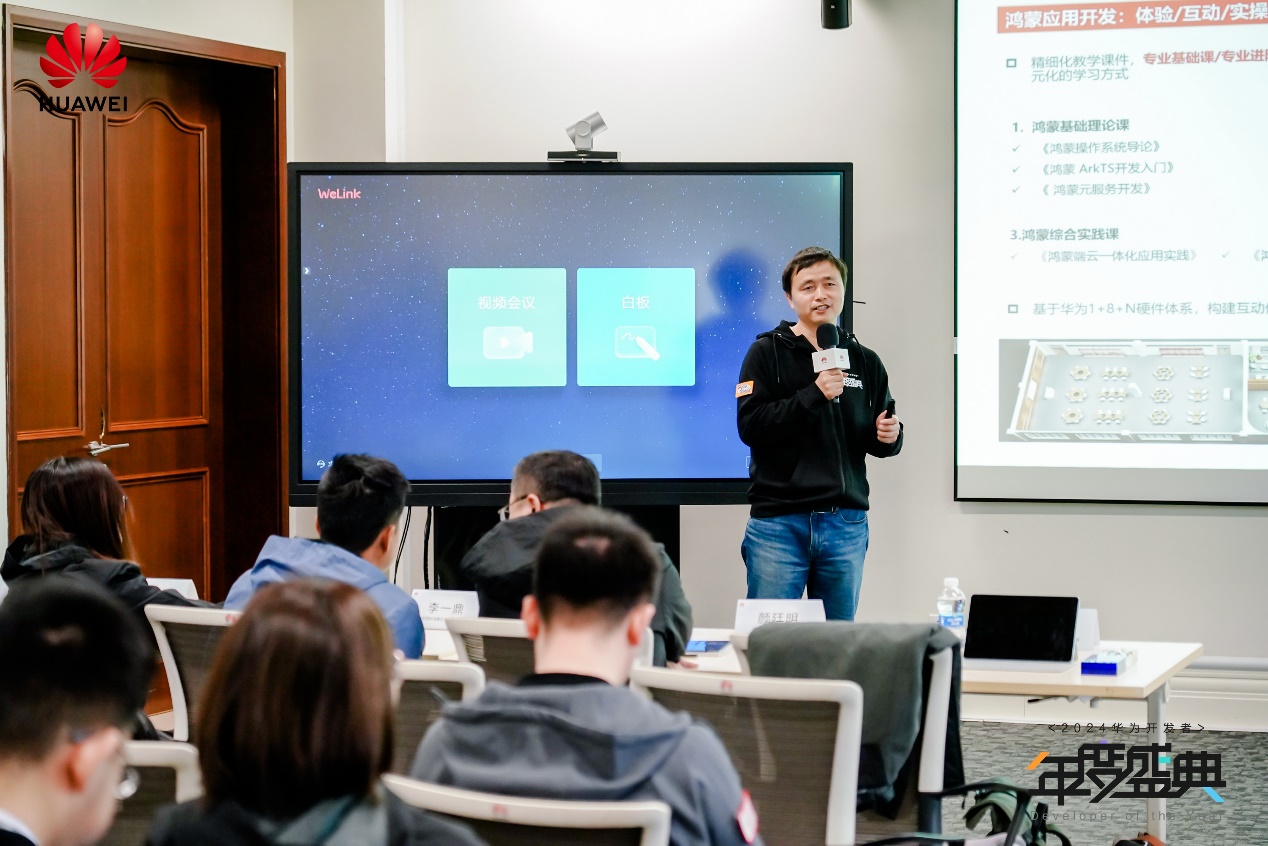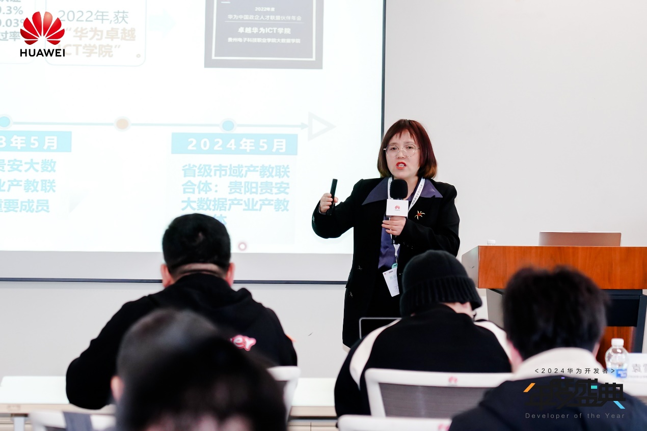 接下来,贵州电子科技职业学院计算机与大数据副院长袁雪梦女士分享了与华为的合作历程,共同打造“2+4”育人模式,拥抱数字时代,培育“数维工匠”。她指出,贵州电子科技职业学院将通过以赛促学、岗位匹配等方式,引领学生通过华为开发者空间进行实践开发,低门槛体验华为工具和资源,让华为开发者空间一站式赋能学生开发创新。