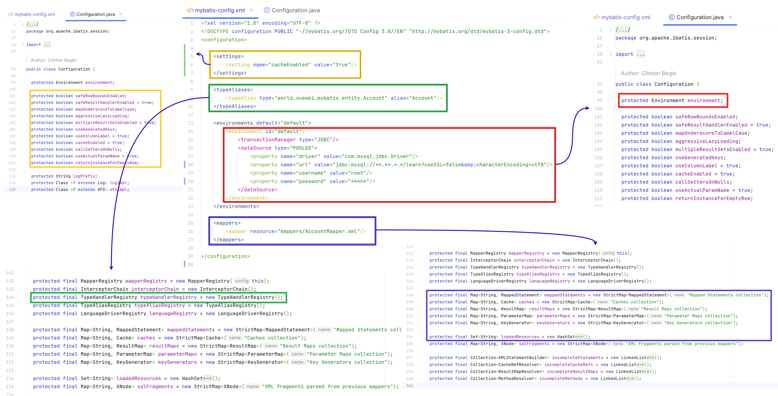 Configuration 类提供了一系列方法,用于获取和设置各种配置信息。例如,我们可以通过 getDataSource() 方法获取数据源对象,通过 getTypeHandlerRegistry() 方法获取类型处理器注册表对象,通过 addMapper() 方法添加 Mapper 接口等。