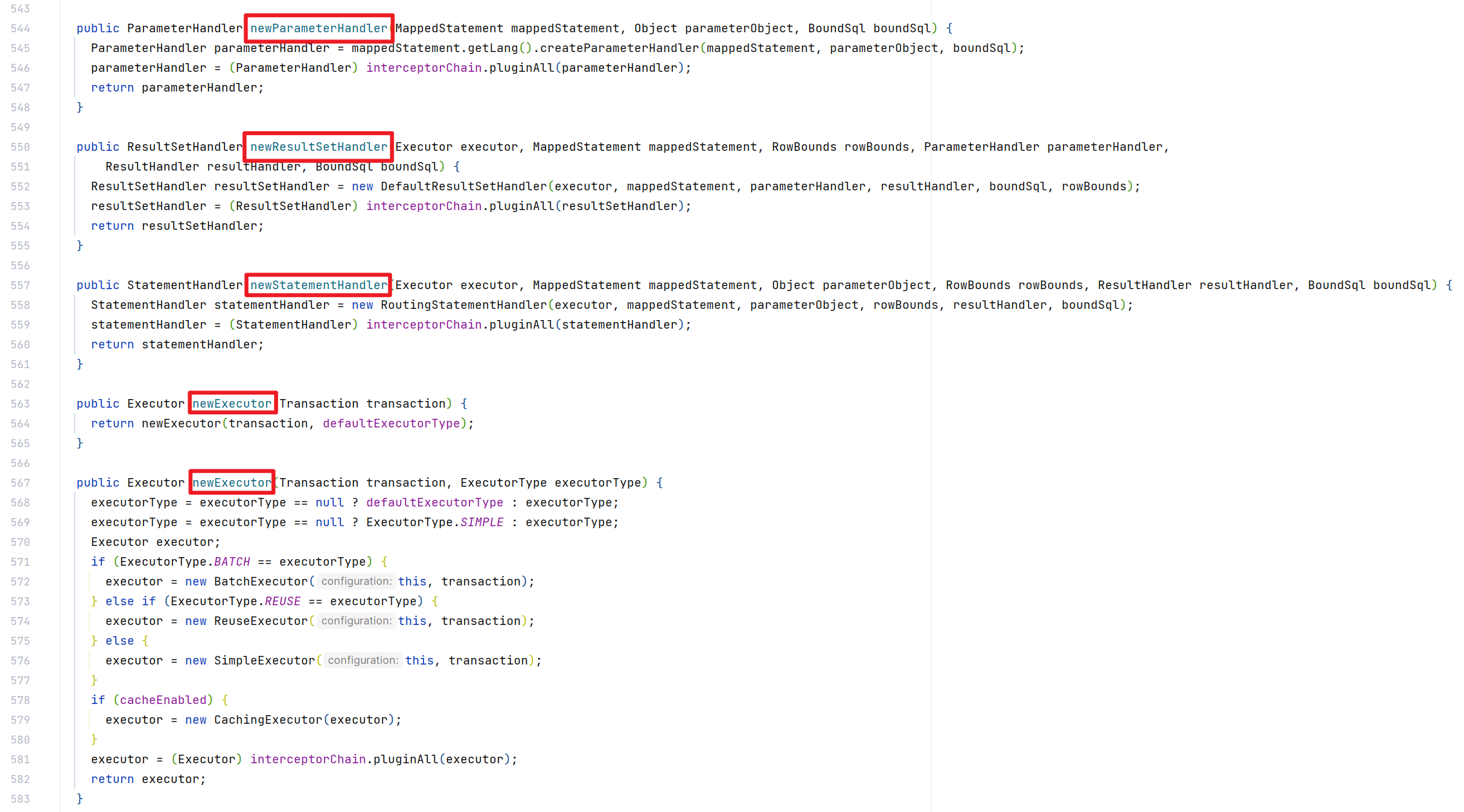 Configuration 类还可以创建其他的核心类实例,提供了如 newParameterHandler、newResultSetHandler、newStatementHandler、newExecutor 等方法。