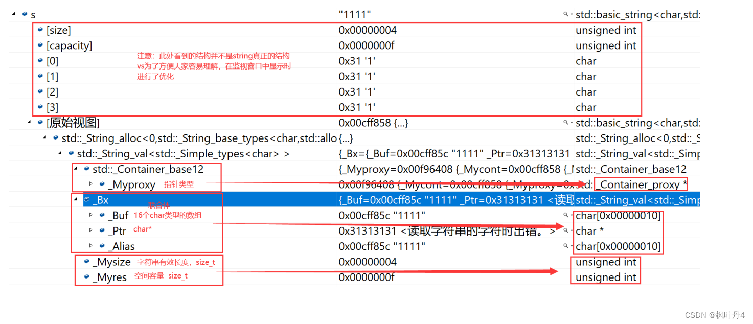 string总共占28个字节,内部结构稍微复杂一点,先是有一个联合体,联合体用来定义string中字符串的存储空间: