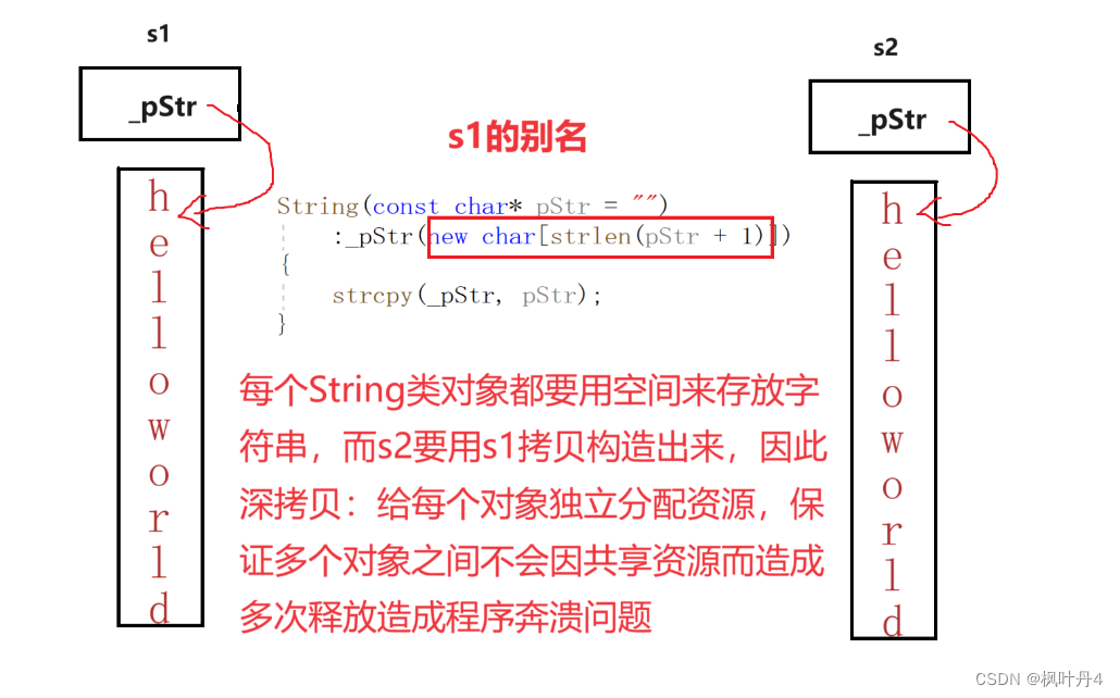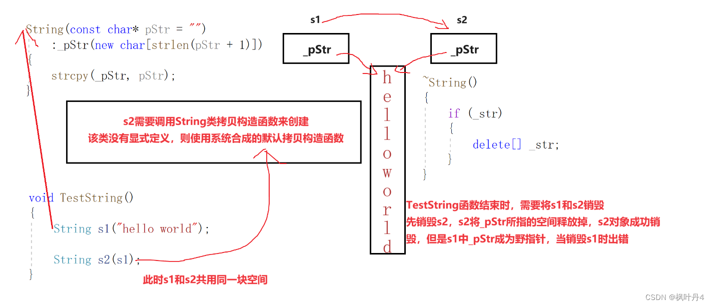 也称位拷贝,编译器只是将对象中的值拷贝过来。如果对象中管理资源,最后就会导致多个对象共享同一份资源,当一个对象销毁时就会将该资源释放,而此时另一些对象不知道该资源已经被释放,以为还有效,所以当继续对资源进项操作时,就会发生访问违规。