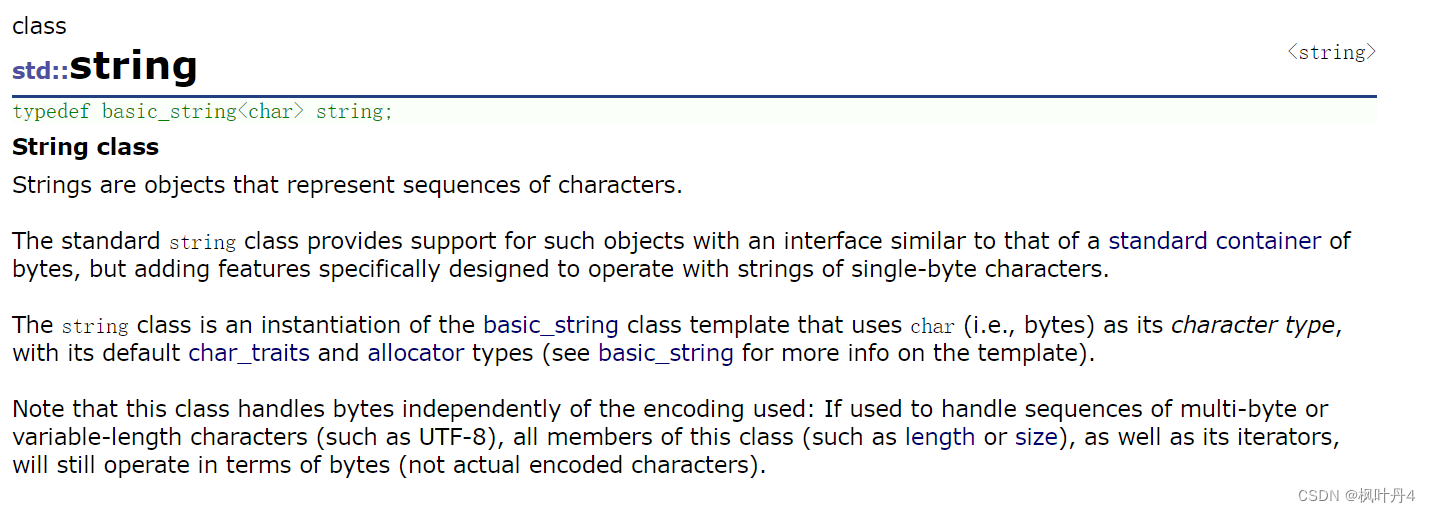- 注意,这个类独立于所使用的编码来处理字节:如果用来处理多字节或变长字符(如UTF-8)的序列,这个类的所有成员(如长度或大小)以及它的迭代器,将仍然按照字节(而不是实际编码的字符)来操作。