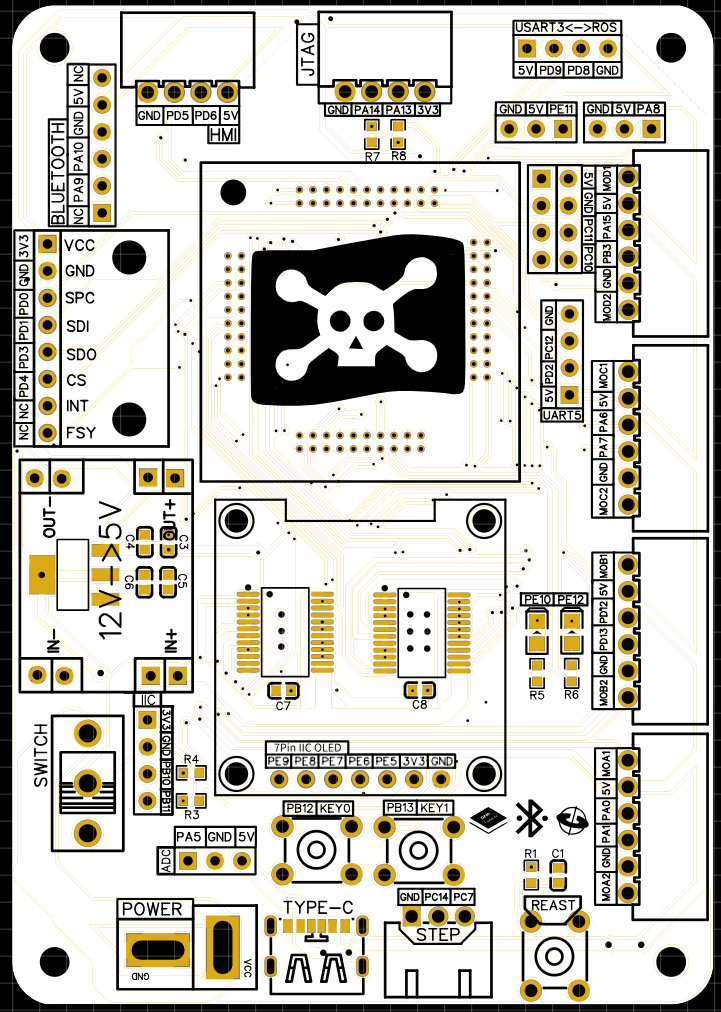 控制器特点:2组舵机接口、4路驱动电机接口、2个按钮模块、LED灯、JLINK接口、OLED 显示屏、内置开关、PS2 接口、HC05蓝牙接口、HMI串口屏接口、IMU 接口、TYPEC供电接口