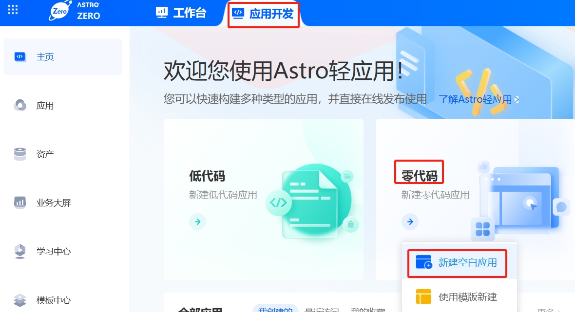 应用开发-零代码-新建空白应用