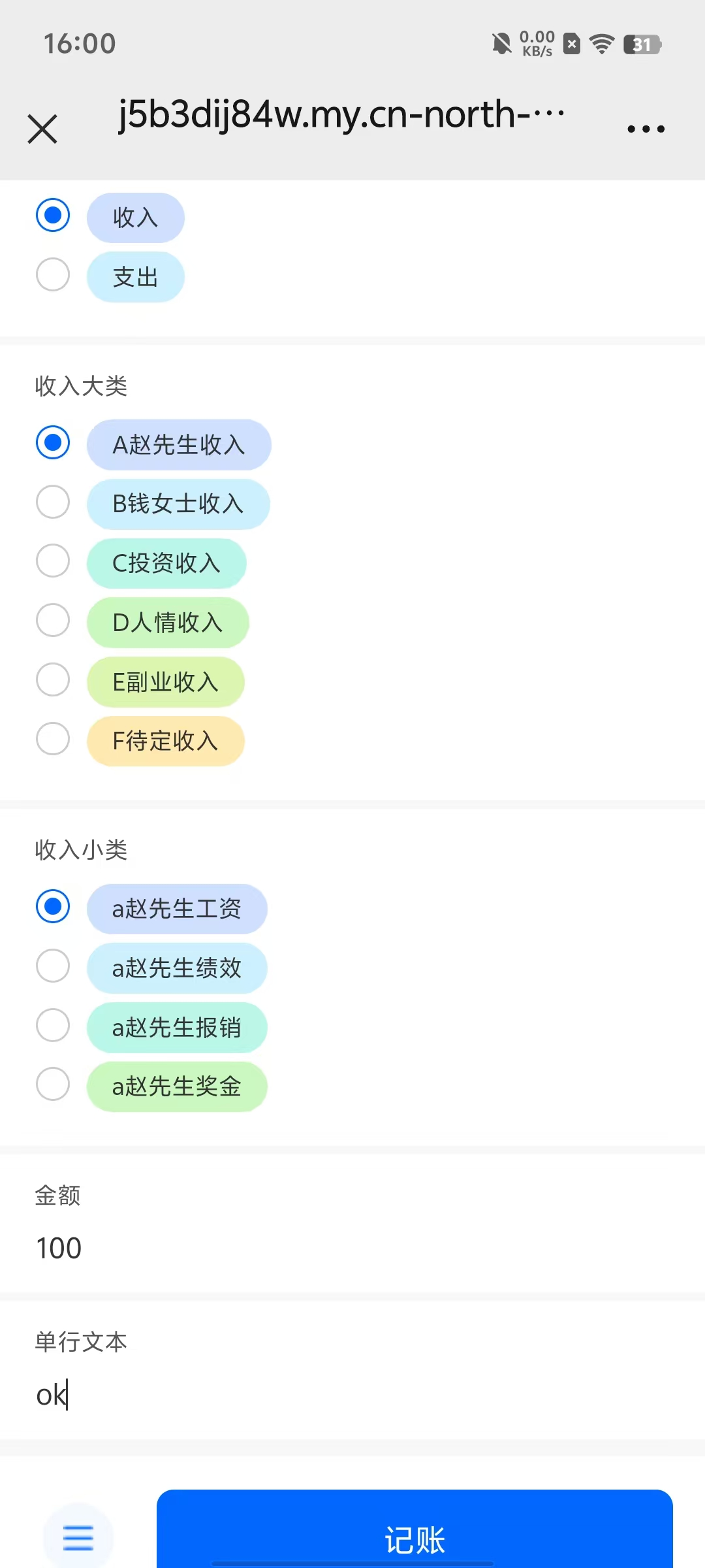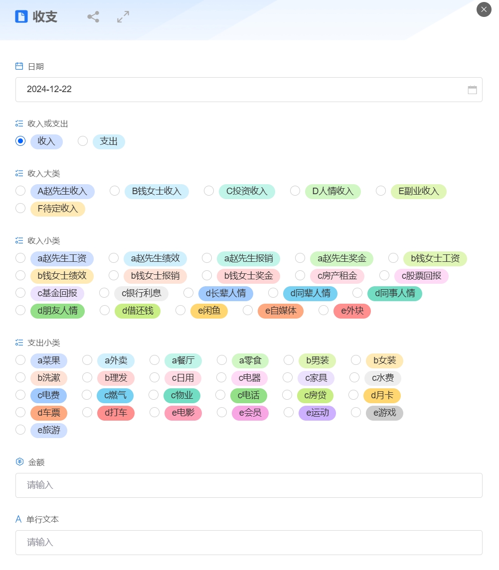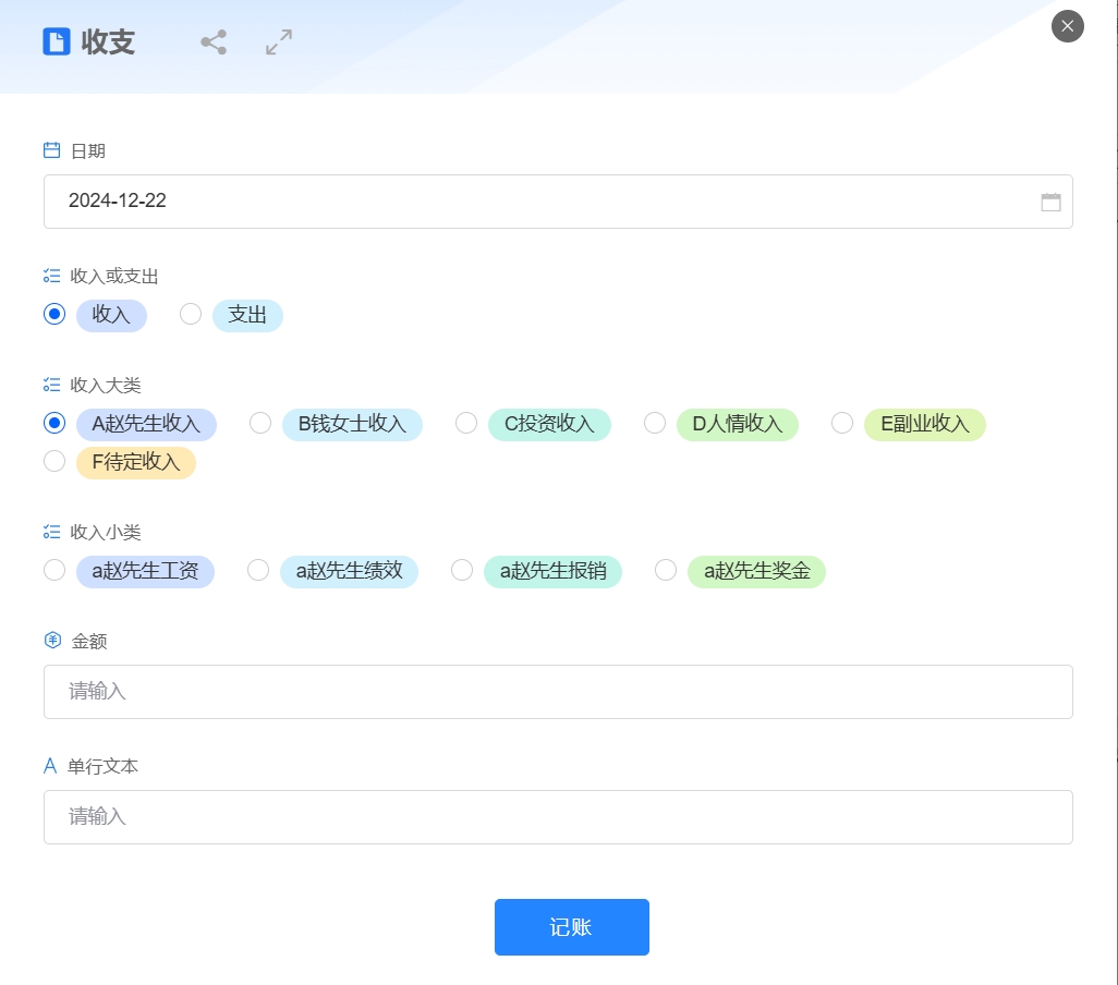 按照教程帖中的说明手册进行控件设置后,返回上一层,选收支,点击新建按钮,查看控件的联动效果