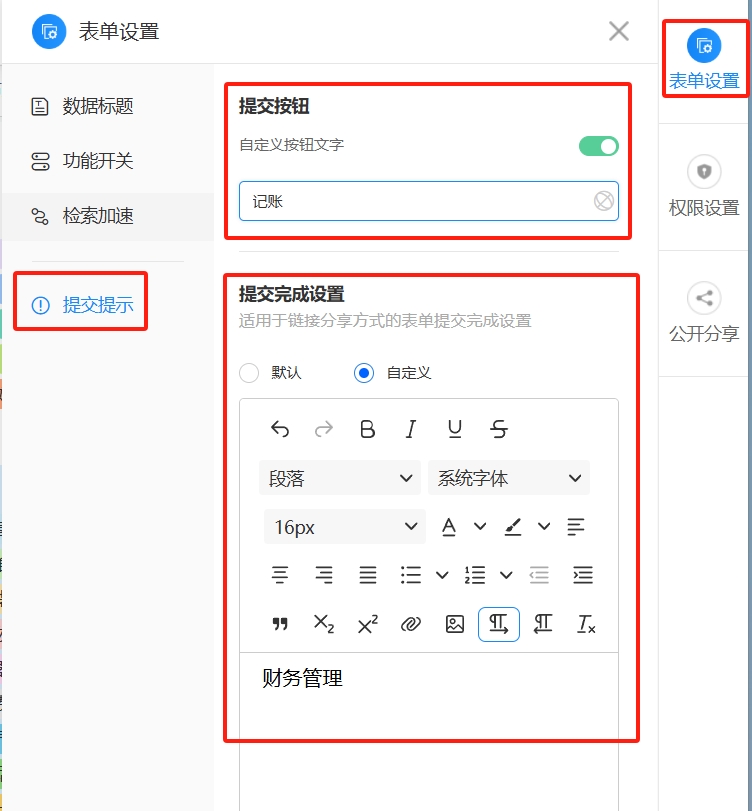 编辑页面的右上角有表单设置,可以自定义提交按钮和更改提交后的跳转页面内容。