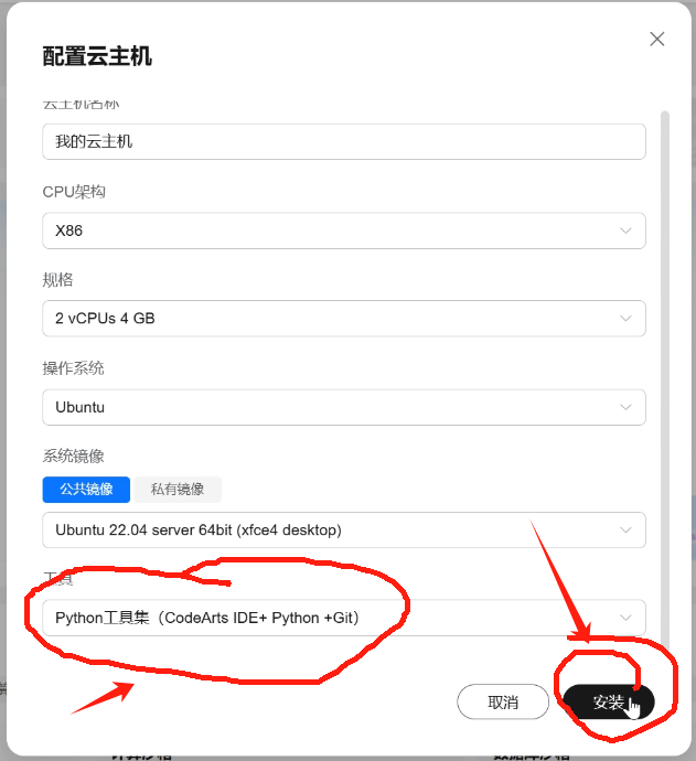 (3)根据自己需要的开发语言要求,对云主机的开发工具进行选择(如我的课程是机器学习课程,用的是python开发语言,选择python后点击安装)