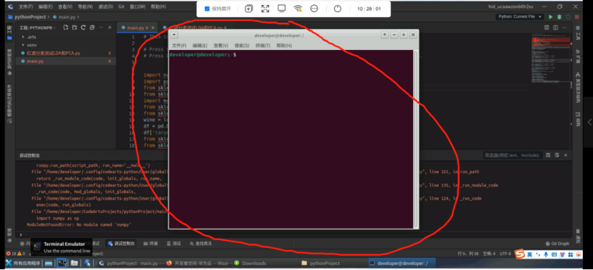 (6)机器学习开发代码主要是红色圈起来的二个应用进行开发的。上面那个是华为云存储空间,通过云存储空间可以把本地文件上传到云主机,下面那个codearts(pythonIDE)就是做实验主要使用的应用,这个应用的界面和pycharm的界面几乎是一样的,也可以安装各种插件。