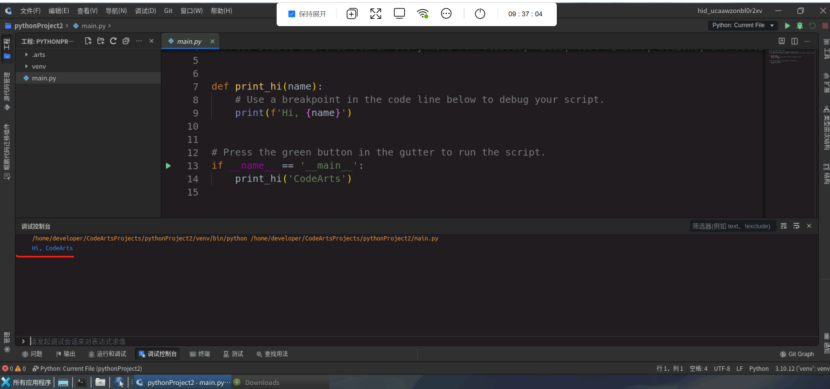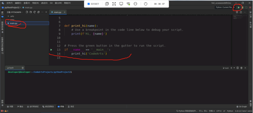 (13)点击创建以后就会看到这个main.py文件,注意看到上面的红色圈起来的绿色箭头吗?那里就是运行按钮用的,旁边的绿色小虫子就是调试按钮