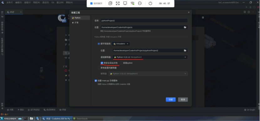 (12)创建一个工程项目。注意这里的python版本都是3.10的所以安装相关第三包的时候也需要注意。