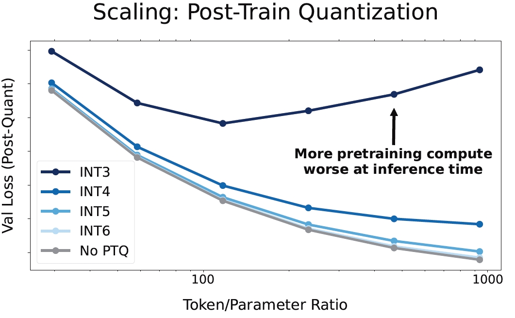 插图展示了一个固定大小的模型在不同数据预算(即训练时的token数量)下使用BF16(Brain Floating Point 16-bit,一种16位浮点数格式)进行训练,并在训练结束后对权重进行量化。