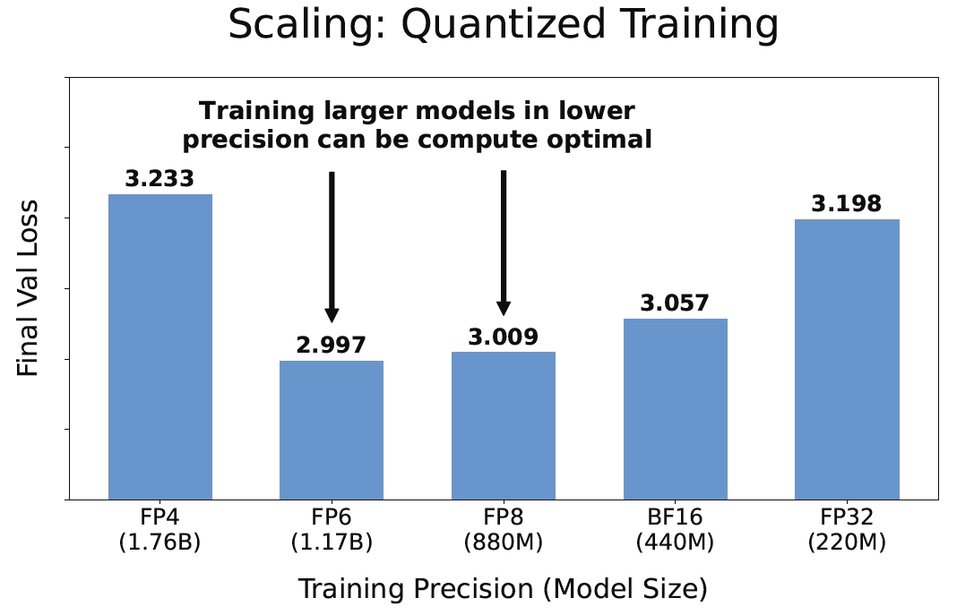 图表展示了不同精度格式 (如 FP4, FP6, FP8, BF16, FP32) 对模型训练损失的影响。随着模型大小的增加,当模型足够大时,在较低精度下进行训练可以实现更优的计算效率,因为低精度减少了计算资源的需求,同时保持了良好的性能表现。