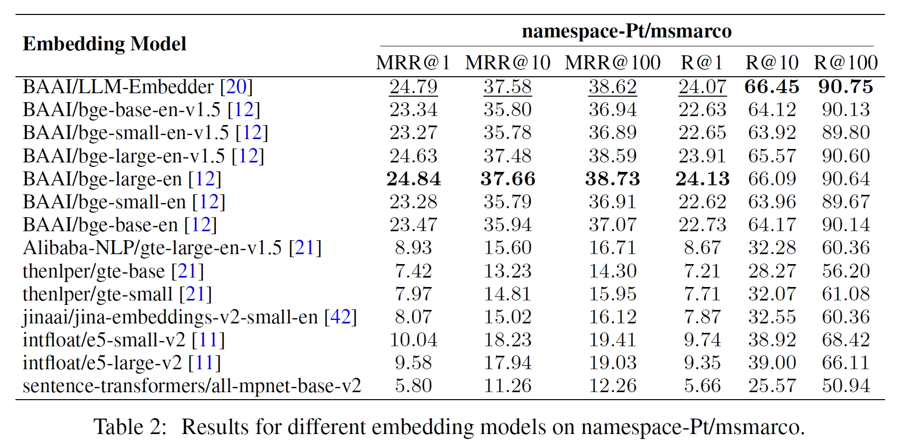在评估过程中,LLM-Embedder 与 BAAI/bge-large-en 取得了相当的结果,但是,前者的尺寸比后者小三倍,在性能和大小之间取得了平衡。因此选择 LLM-Embedder。