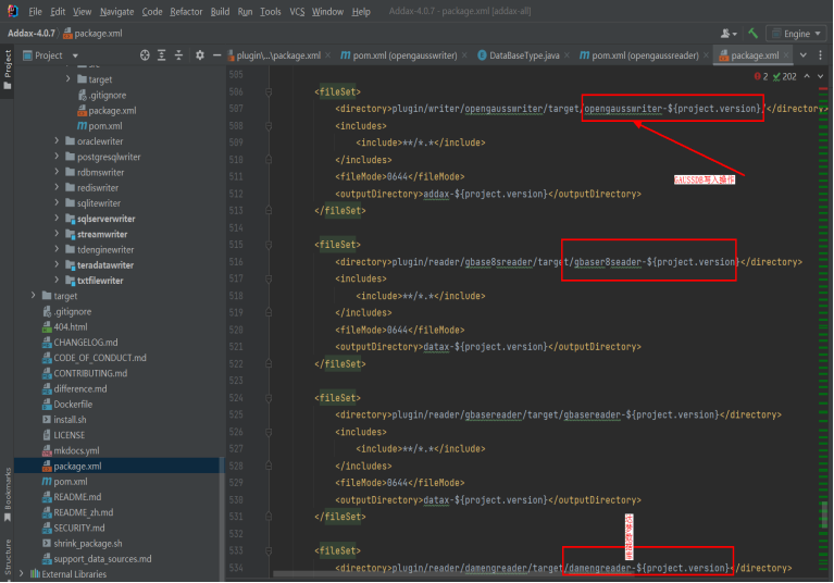 为了节省打包时间,只把需要验证的插件模块打包进来,修改总工程pom.xml文件(重点验证GAUSSDB,达梦,TERADATA,GBASE在本次不作验证)。
