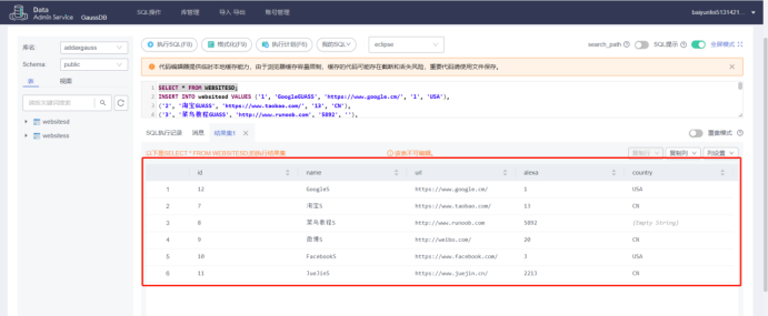 登录数据库:addaxgauss,创建两张作实验验证插件表,分别为WEBSITESS 和WEBSITESD,接着把对应的数据插入到对应的源表中。