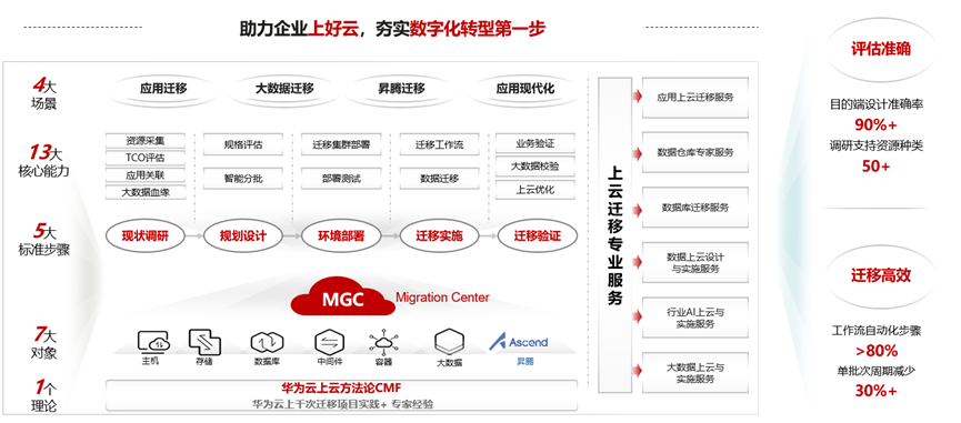 上千次迁移项目的实施实践沉淀出华为云上云方法论CMF,并以此打造出一站式迁移中心MGC。MGC作为一站式迁移平台,集成了7大迁移对象、定义了5大标准步骤、囊括了13大核心能力,支持4大迁移场景。系统化的方法论和领先的平台能力,结合上云迁移专业服务,形成一站式迁移解决方案,助力企业上好云,夯实企业数字化转型第一步。