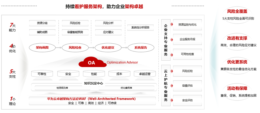 华为云卓越架构方法论是聚焦客户业务上云后关键问题的设计指导和最佳实践,为云上企业提供全面的指导框架。优化顾问服务(OA)涵盖卓业架构5大支柱的最佳设计指导和实践,并转化为规则检测项,使能企业生产系统架构体检。同时通过4阶优化流程,7大关键能力,识别客户生产系统架构中存在的隐患和风险,并针对优化内容给出最为合理的优化建议。OA服务结合企业支持专业服务、云上护航专业服务,为云上企业业务架构保驾护航,持续使能企业架构卓越。