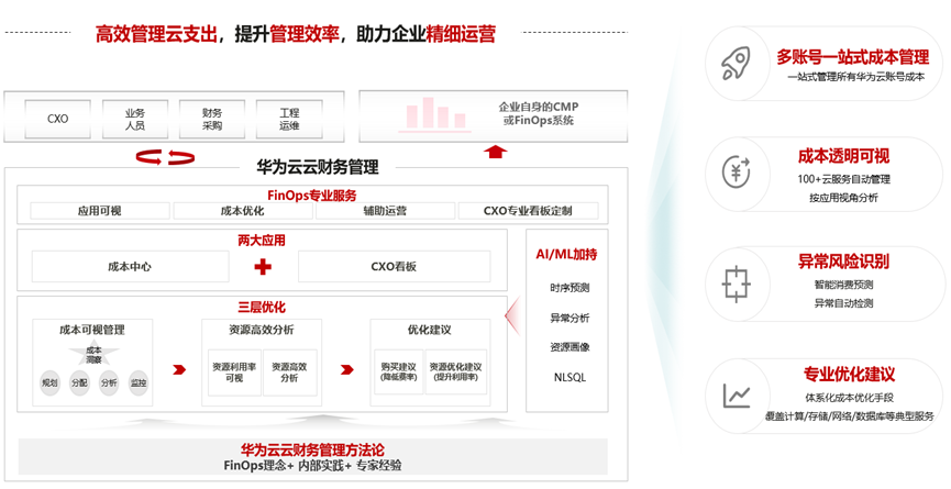 华为云结合业界FinOps理念、华为内部实践及专家经验,形成华为云云财务管理方法论。在此方法论的指导下,结合AI能力,构筑出全场景成本可视管理、资源高效分析、成本优化建议三层优化能力,打造出成本中心、CXO看板两大核心应用;同时结合云财务治理专业服务,形成CFM云财务管理解决方案,使能客户高效管理云支出,提升管理效率,助力企业精细运营。