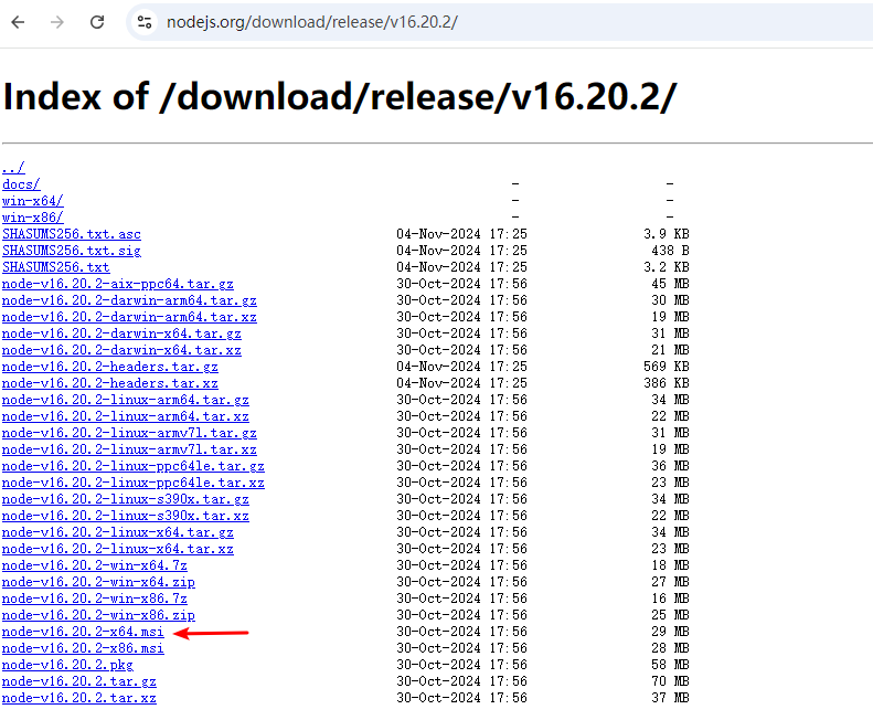 这个是V16版本,https://nodejs.org/download/release/v16.20.2/,windows,选择自己操作系统需要的软件:
