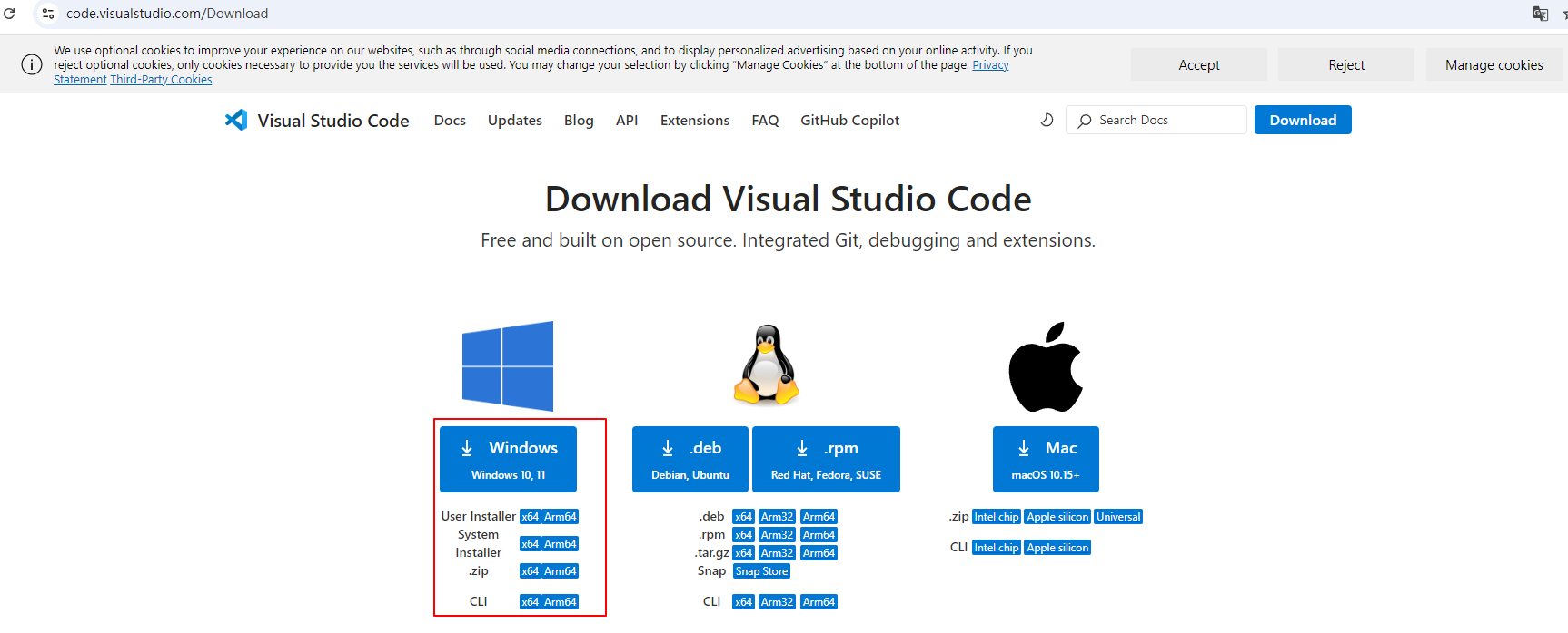 1.下载VSCODE,网址:https://code.visualstudio.com/Download,选择合适的版本下载。