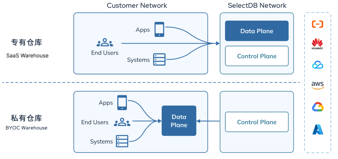 针对不同客户的要求,SelectDB Cloud 提供了两种部署形态:SaaS(Software as a Service)和 BYOC (Bring Your Own Cloud)