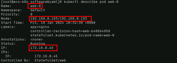 ➤ 步骤 8 再次查看web-0的POD的名称、IP地址和所在的节点信息是够发生变化。