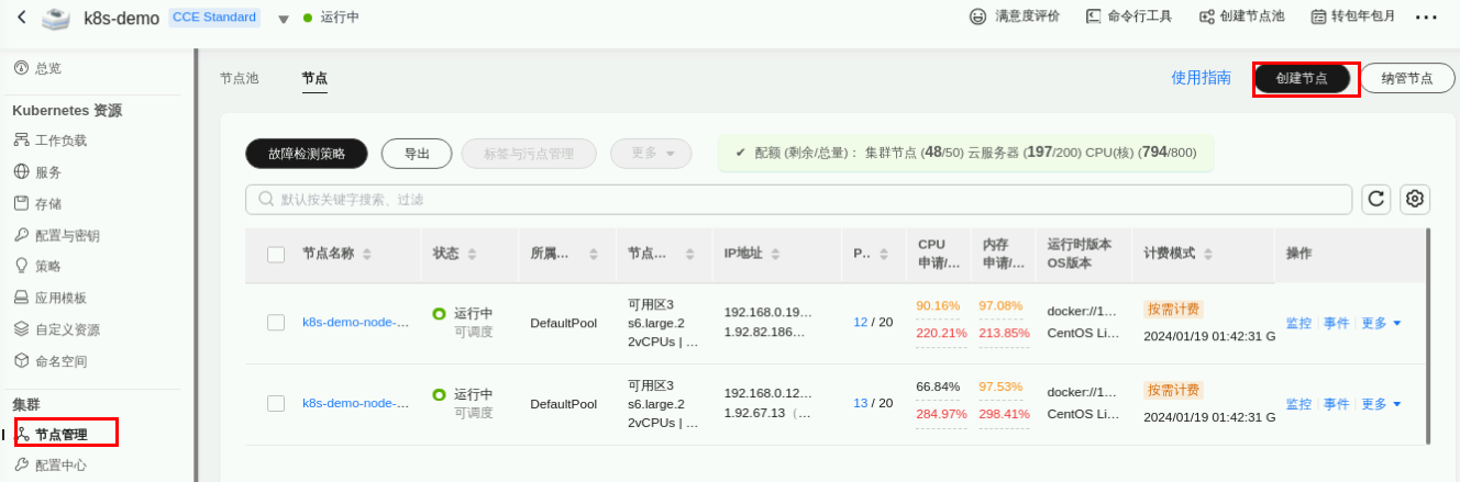 ➤ 步骤 4 返回华为云CCE控制台,选择资源管理>节点管理,单击购买节点。