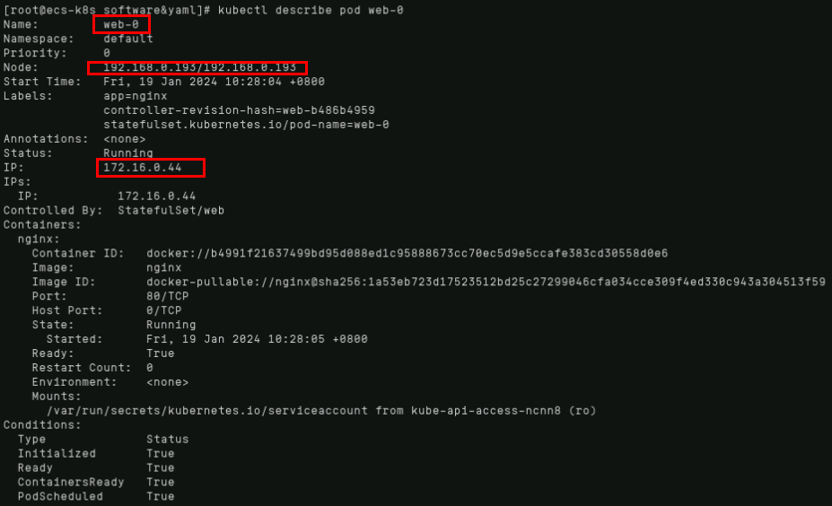 ➤ 步骤 5 通过以下命令查看web-0的POD的名称、IP地址和所在的节点信息。