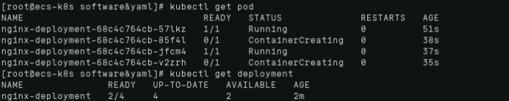 ➤ 步骤 2 通过命令行查看Deployment状态和POD状态。