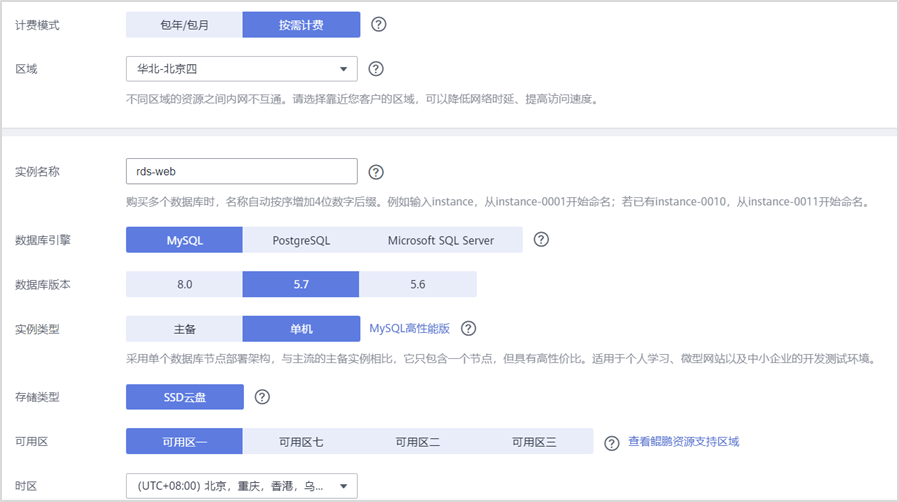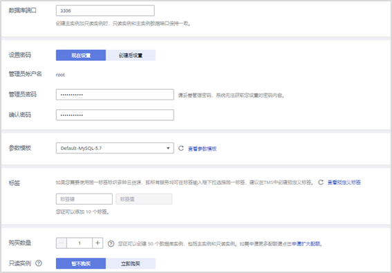 3. 在购买数据库实例页面中,设置实例参数如下: