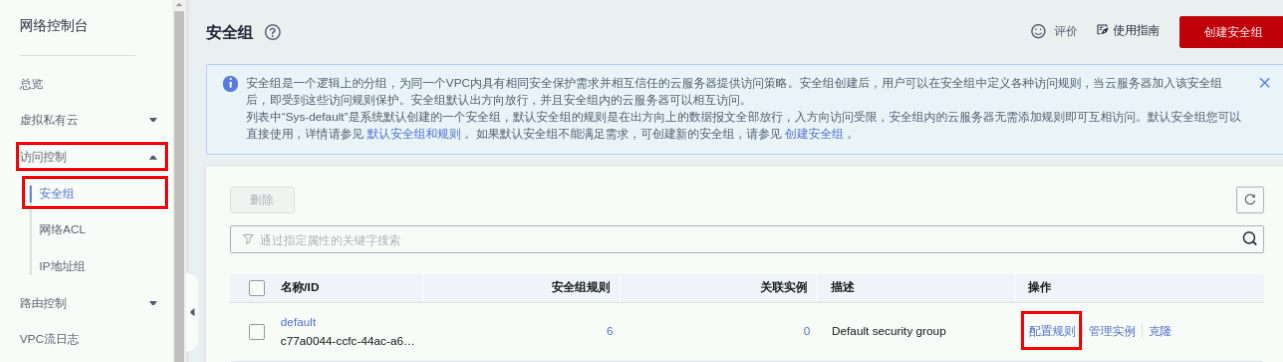 4. 在网络控制台左侧菜单栏中,点击“访问控制 > 安全组”进入安全组页面,选择default默认安全组右侧的【配置规则】。