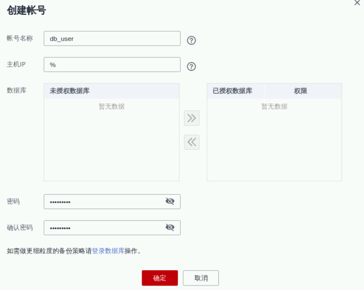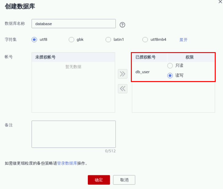 10. 在弹出的窗口中,输入数据库名称,选择已创建的数据库账号授予“读写”权限后,点击确定。