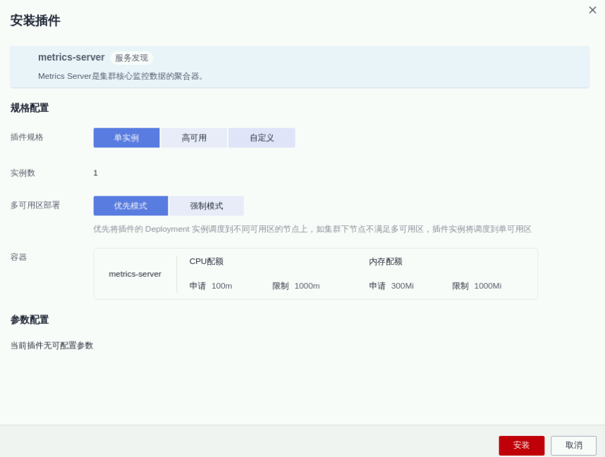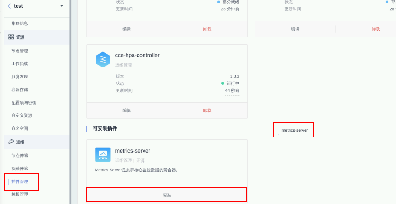 7. 选择左侧菜单栏中的“插件管理”,搜索并安装metrics-server插件。