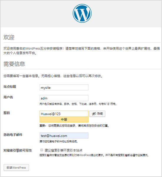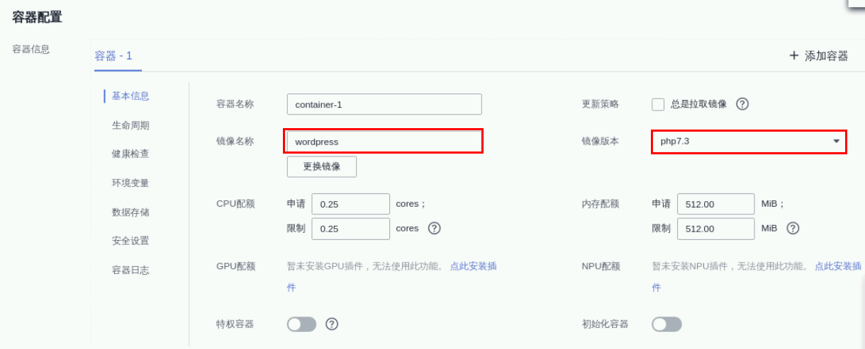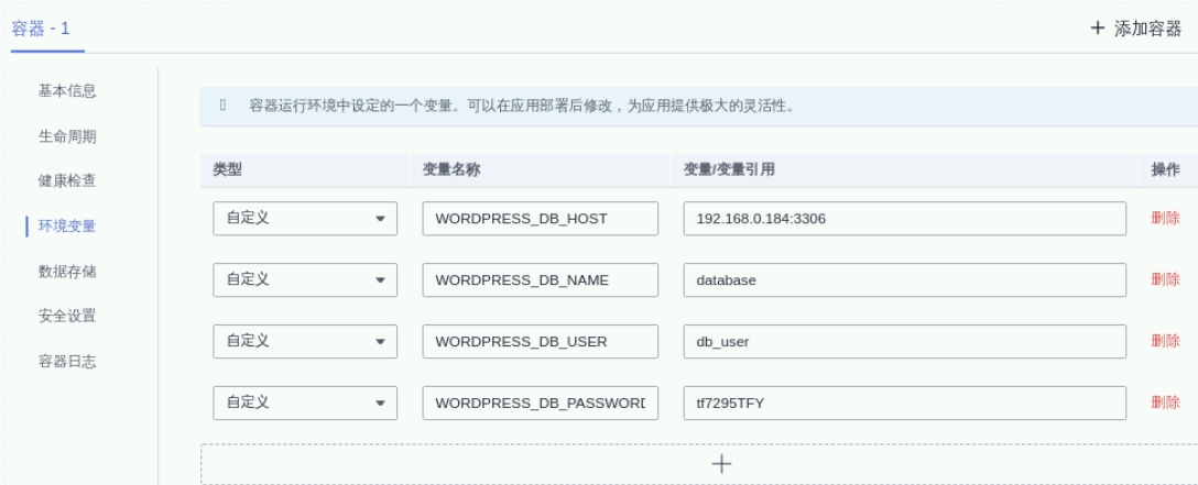 (变量名)WORDPRESS_DB_PASSWORD:(变量)数据库管理员密码,与前面RDS创建的账号时设置的密码一致)