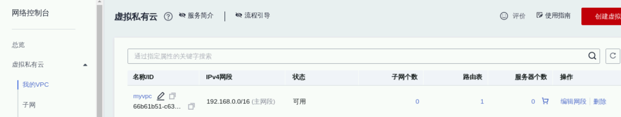 3. 返回“虚拟私有云”界面,可查看到已创建好的虚拟私有云myvpc。
