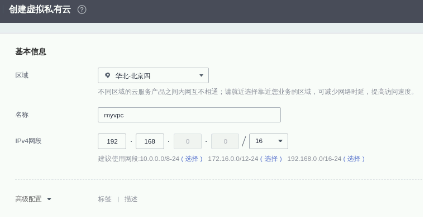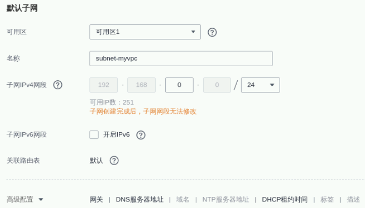 虚拟私有云:选择已创建的虚拟私有云及子网,如myvpc及subnet-myvpc