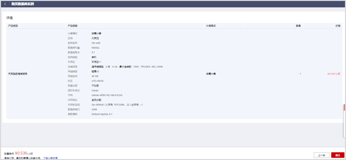 4. 点击“立即购买”,确认数据库实例信息后,点击“提交”。