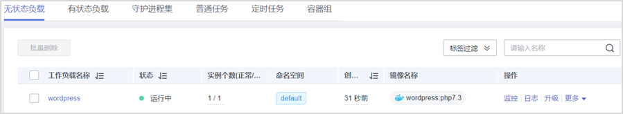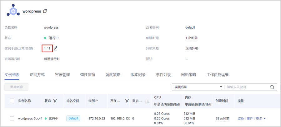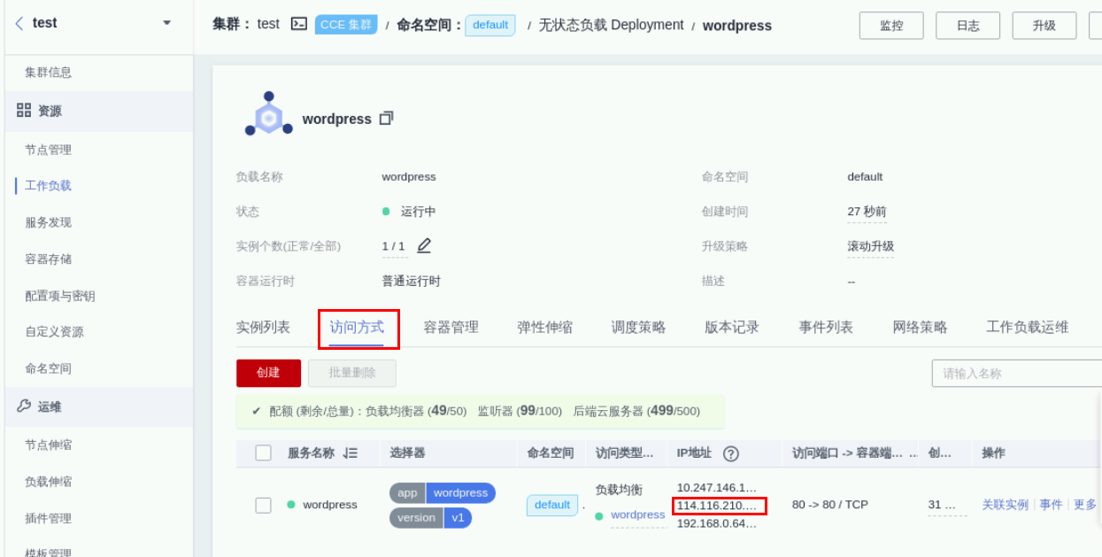 工作负载状态变为“运行中”后,点击工作负载名称,在“访问方式”页签中获取外部访问地址(带公网ip的地址),打开wordpress界面。