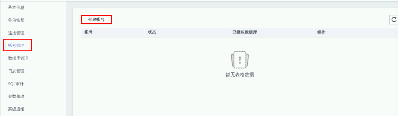 7. 进入数据库管理界面,在“账号管理”标签下,选择“创建账号”。