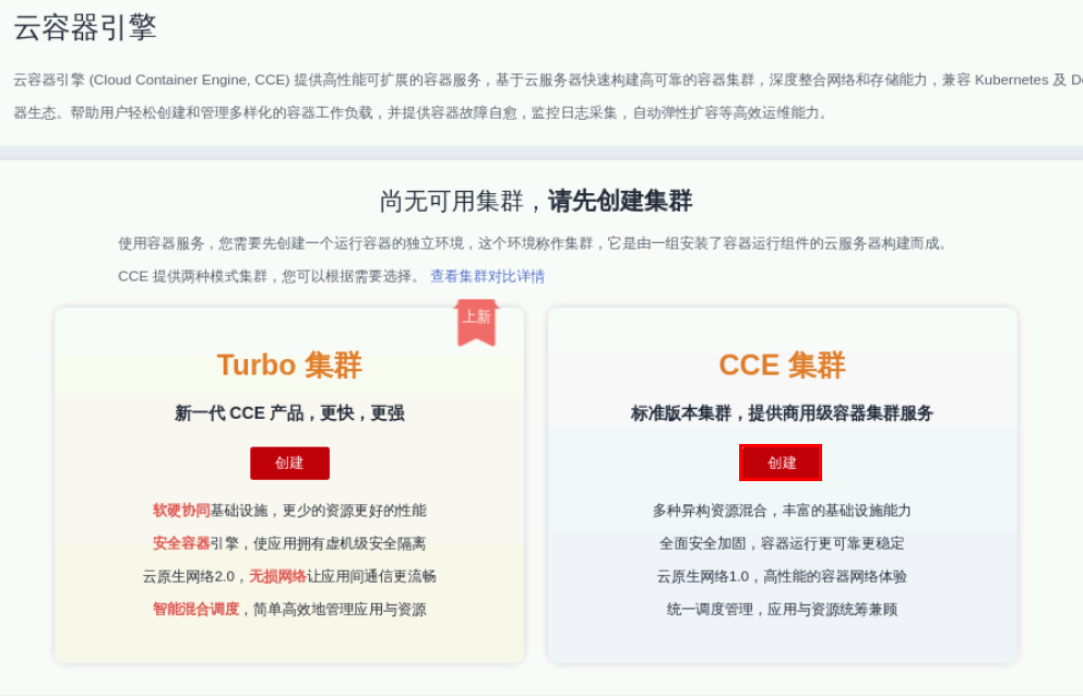 2. 在云容器引擎“总览”界面,选择CCE集群,点击“创建”。