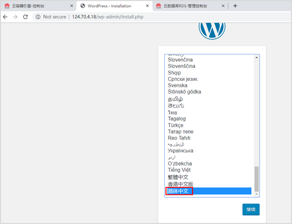 7. 打开网页后,进行wordpress在线安装配置。设置语言为“简体中文”,单击“继续”。