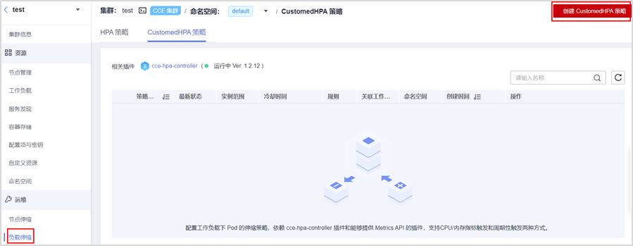 9. 选择左侧菜单栏中的“负载伸缩”,单击“CustomedHPA策略”,并选择右上角的“创建CustomedHPA策略”。配置负载弹性伸缩策略。