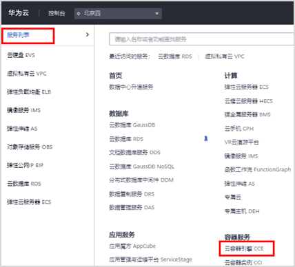 1. 返回控制台,在“服务列表”下选择“容器服务 > 云容器引擎CCE”,进入云容器引擎页面。
