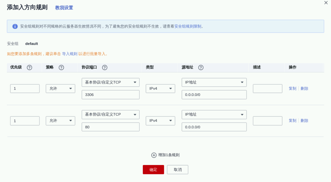 5. 点击“添加规则”,并在弹出窗口中为default安全组添加一条如下图所示的入方向规则。放通3306及80端口。