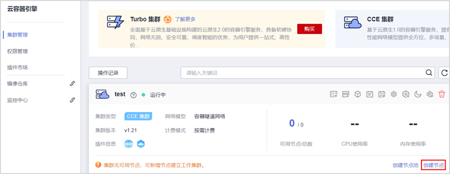7. 等待约5分钟左右,管理集群创建完成。返回集群管理界面,点击“创建节点”。