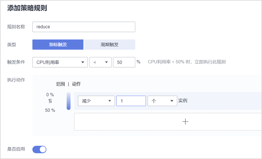 10. 点击“确定”。可以看到策略已经创建成功,状态为“已启用”。等待两分钟后,可以观察到实例数量已经逐步自动减少。