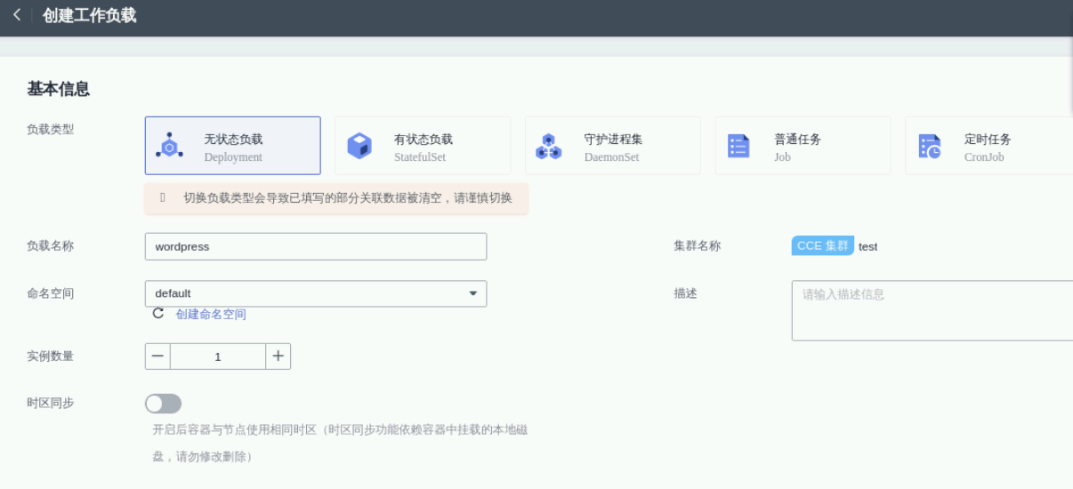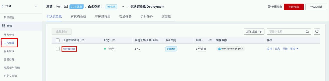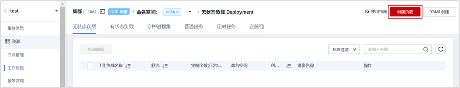 1. 完成集群创建后,点击左侧菜单栏中的“工作负载”,进入到“工作负载”界面,点击“创建负载”。