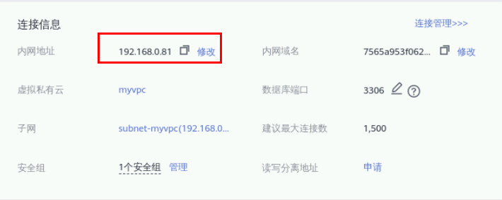 记录下数据库实例的内网地址,此地址将用于后面容器的环境变量配置。