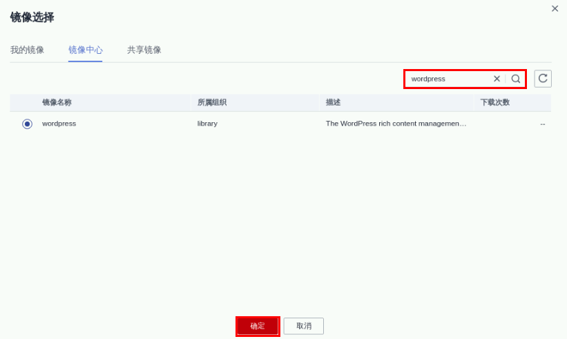 镜像名称:单击“选择镜像”,在弹出的镜像选择窗口中,选择“镜像中心”,搜索并选择 wordpress。