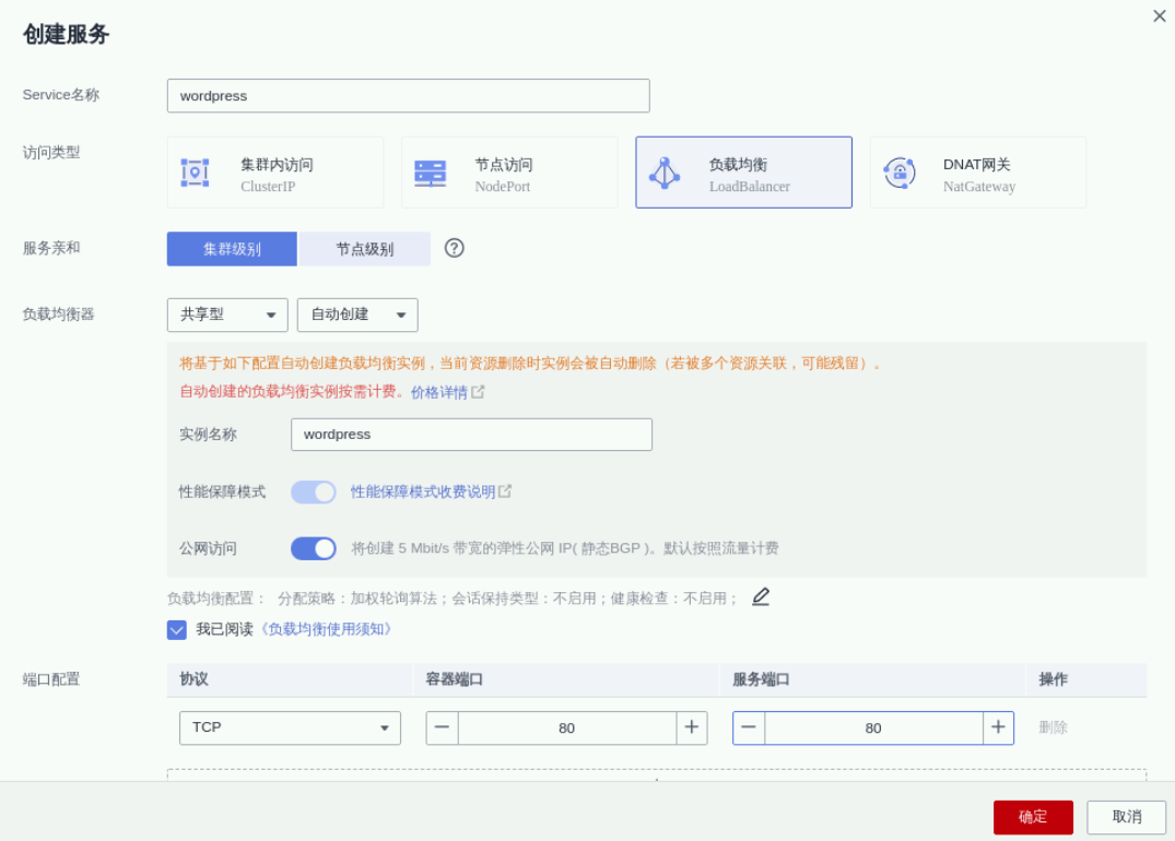负载均衡器:共享型,自动创建,设置示例名称为wordpress,并勾选使用须知
